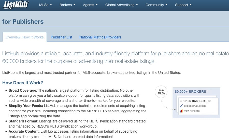 ListHub is North America’s leading real estate syndication platform. As a ListHub publisher, you have access to listings from over 500 MLS across the United States.